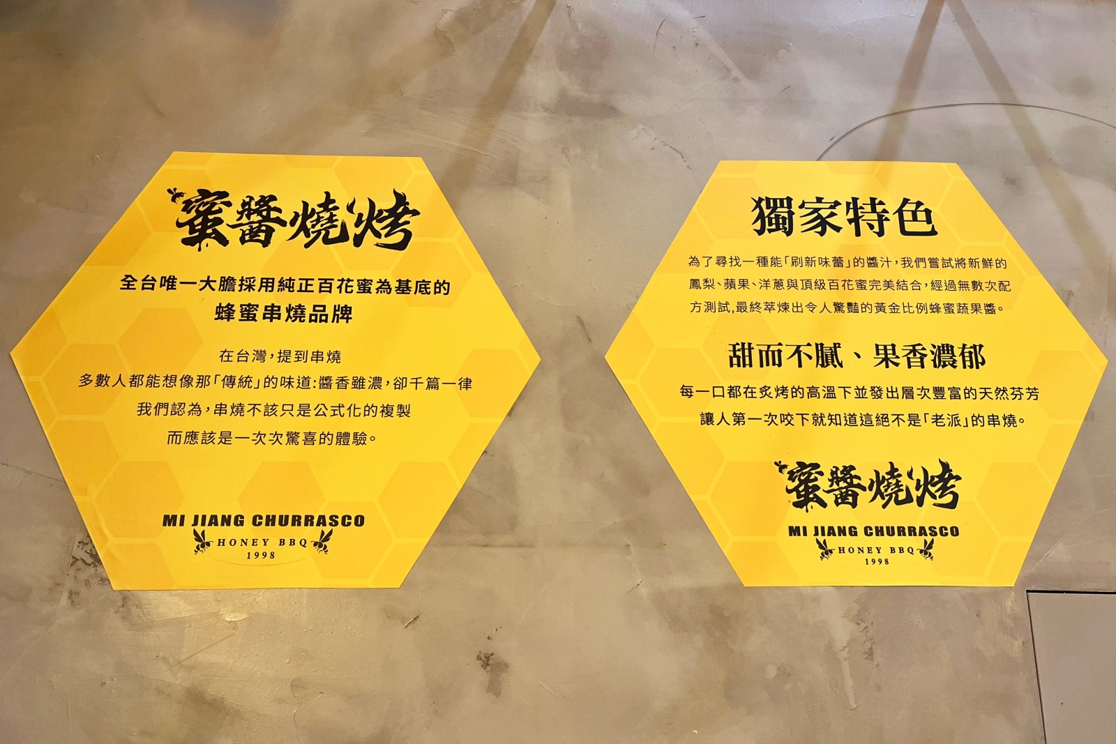 「蜜醬燒烤」有別於一般市面上的燒烤,主打的是「全台首創蜂蜜燒烤」,以天然百花蜜為靈魂,搭配鳳梨、蘋果、洋蔥慢火熬製獨門醬汁,甜而不膩、果香濃郁,顛覆傳統厚重口味的串燒印象!