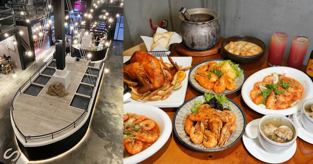 甚至還看得到碼頭、釣魚與釣蝦等設計元素,最令人驚豔的是竟然在餐廳正中央擺放一整艘船,有夠霸氣!