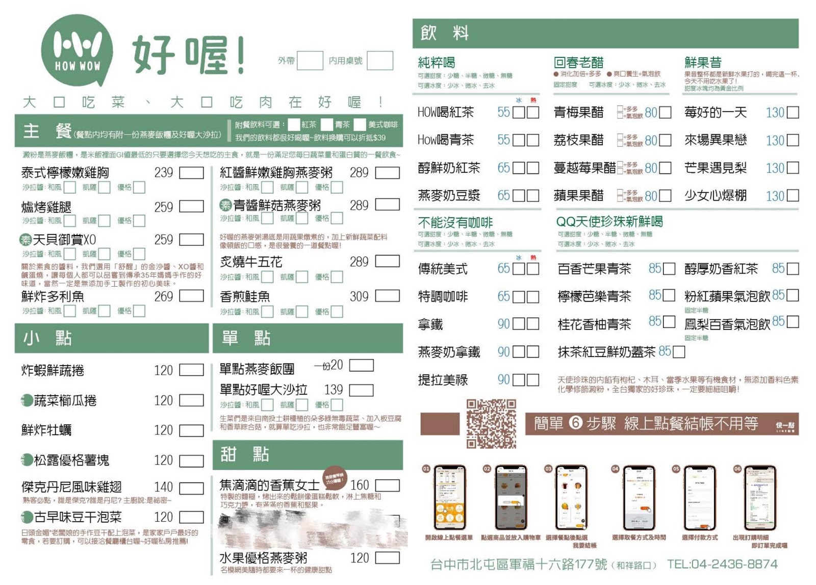 這裡提供好喔目前最新的菜單給你們參考,每人低消為$150元,wifi密碼是8個8,有提供多種主餐、小點、甜點與飲料;最酷的是還能線上結帳,菜單上就有提供簡易的操作教學,不過要留意如果是要以現金結帳的話,還是要到櫃檯直接點餐哦!