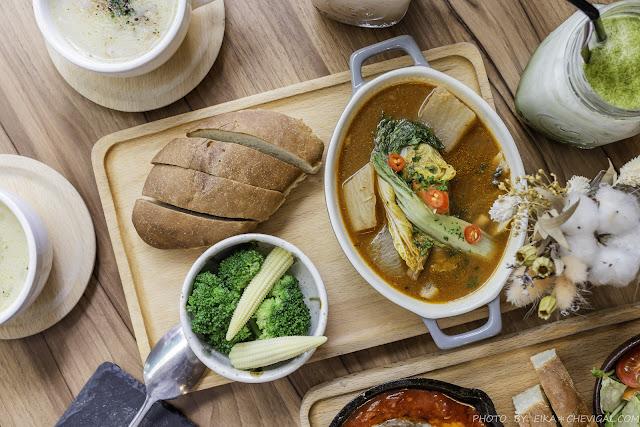 早午餐與午餐皆可升級為不同形式的套餐,像我們這天就升級加購了飲品、湯品與甜點,更換飲品可再折抵50元。濃湯裡頭的蔬菜非常多,撈起來都是滿滿的料,喝來相當溫順鮮甜。