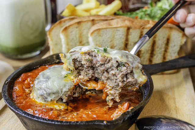 漢堡排的質地特別紮實,裡頭吃得到洋蔥丁與黑胡椒的細緻辛香,搭配番茄的濃郁果香,大口咬下非常過癮!愛吃肉的朋友真的不要輕易錯過啦~