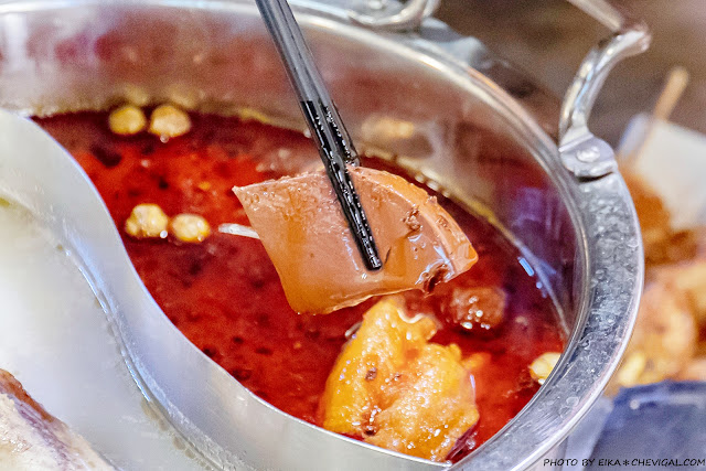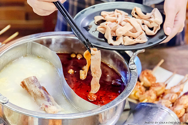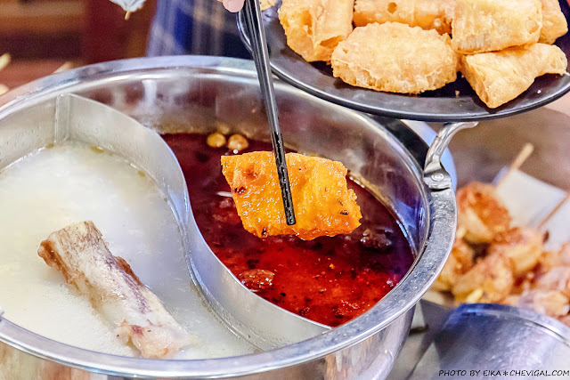 鴛鴦辣串燙以四川經典麻辣與奶香大骨湯兩種湯底組成,麻辣的辣度真的沒在客氣,剛吃幾口就讓人忍不住開始流汗,具有厚度的辣香讓人又愛又恨~怕辣的朋友可以試試奶香大骨湯,以大骨、雞骨與鮮奶油熬製而成的湯底,溫潤又不失濃郁。