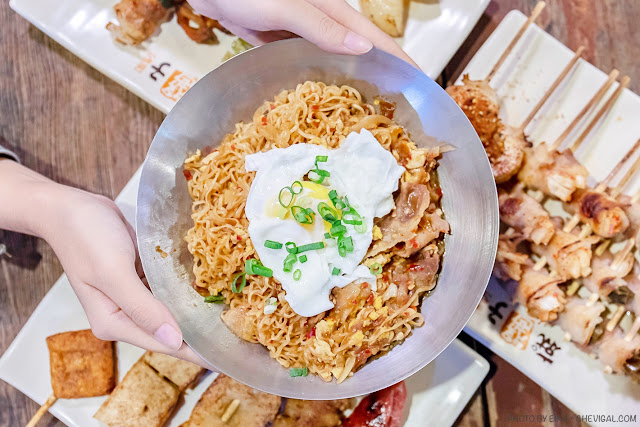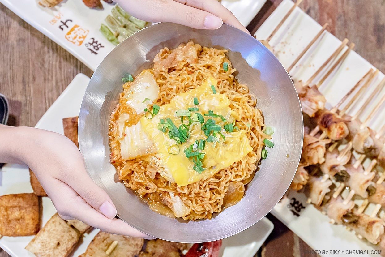 蛋香辣醬炒泡麵$88元,就醬子烤吧的炒泡麵幾乎可以說是每桌必點,喜歡吃辣的朋友可以選擇這道以大辣椒、小辣椒與油蔥酥調味而成的口味,辣香帶勁又入味,份量也給得大方~