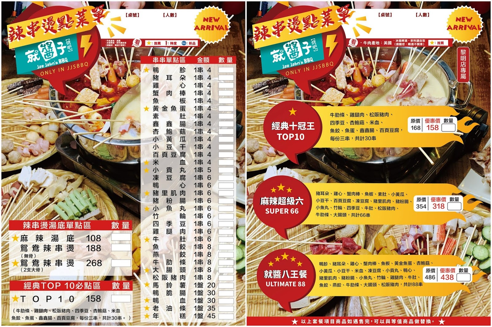 這邊提供就醬子烤吧的菜單給你們參考,主要可以分為火鍋系列、串燒系列、泡麵系列與飲品系列,另外還有各式台菜料理,選擇性非常多,自己來吃飯或與多人聚餐都很彈性。