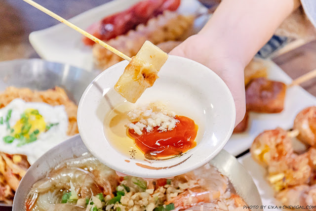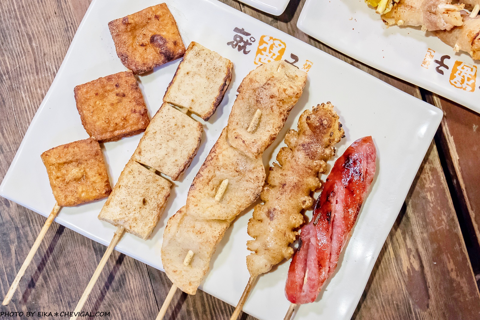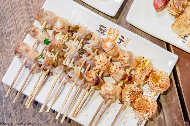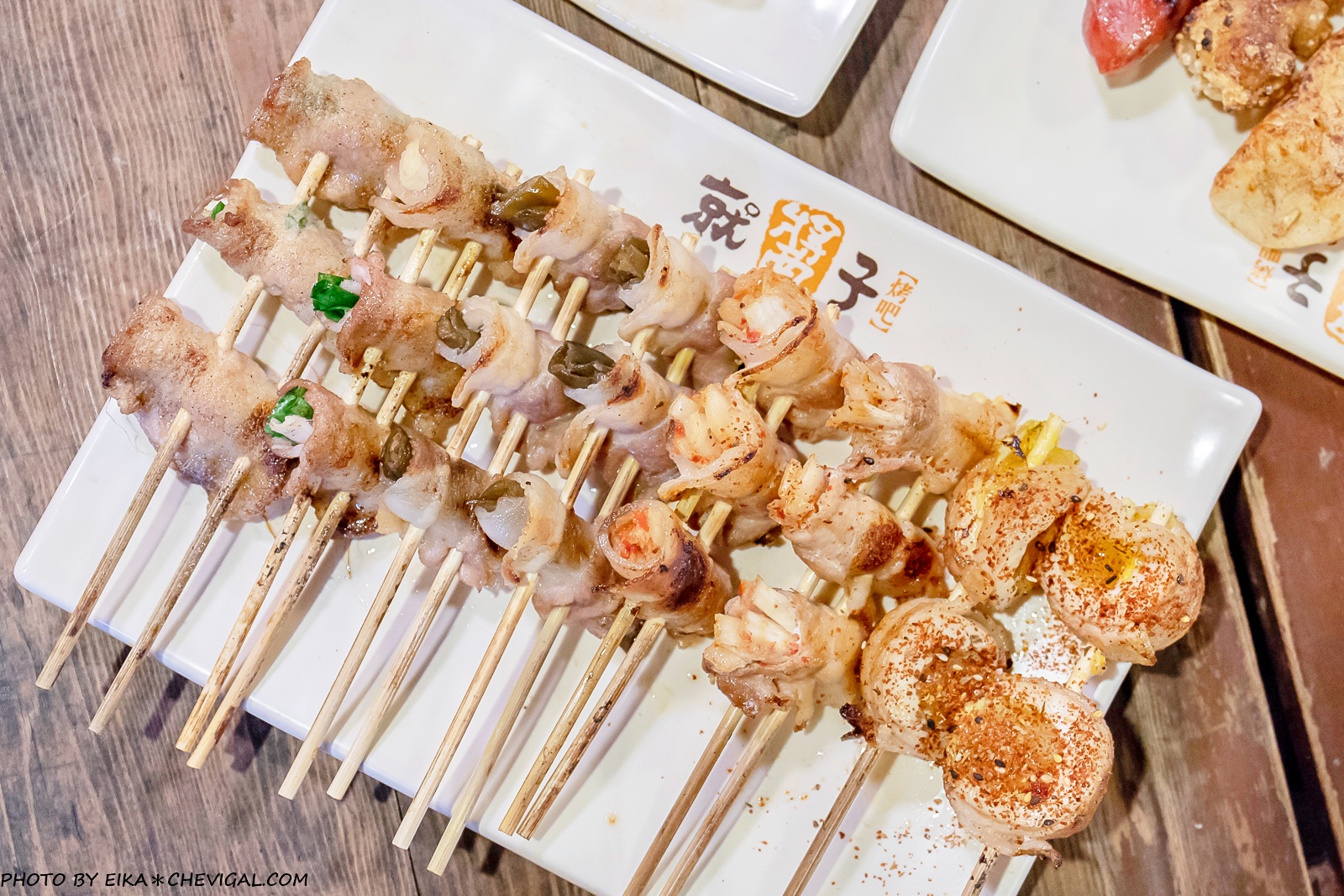 就醬子烤吧的串燒種類還蠻豐富的,目前約有40種品項可以選擇,像是洋蔥、四季豆、脆皮肥腸、雞腿肉串與松阪豬肉,或是米腸、香腸、甜不辣、百頁豆腐與豆干,都是蠻多客人會點的種類。
