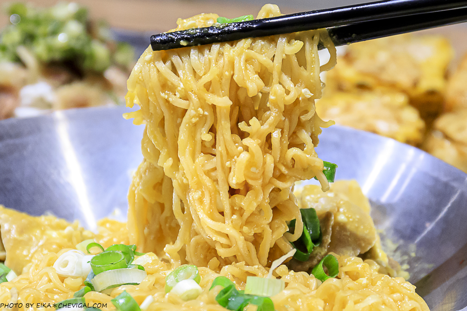 泡麵炒得相當入味,搭配豬肉片、鹹蛋黃、南瓜與蔥花一同拌炒,鹹甜香氣之中還能感受到鹹蛋黃细腻微沙的口感,如果加辣應該會更好吃!