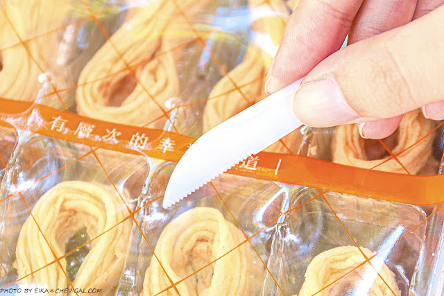 六月初一的8結蛋捲基本上都是真空封膜包裝,才能保持新鮮衛生與酥脆的口感,所以每盒都會附有一把塑膠小刀,可以輕鬆地劃開真空封膜。不過真心建議你們想吃多少再拆多少,因為蛋捲接觸到空氣後軟化的速度還蠻快的,拆開馬上享用就對了!