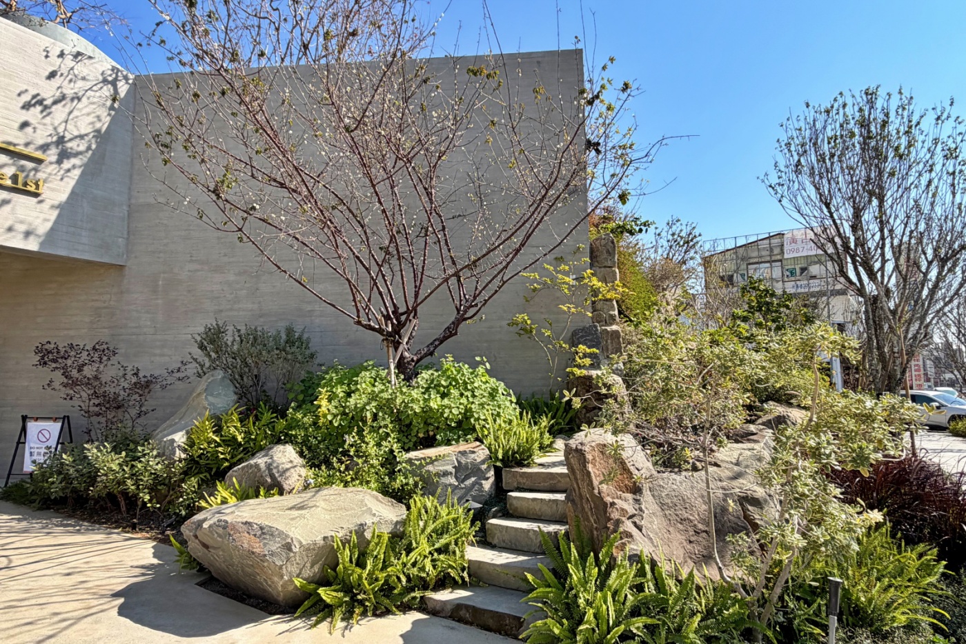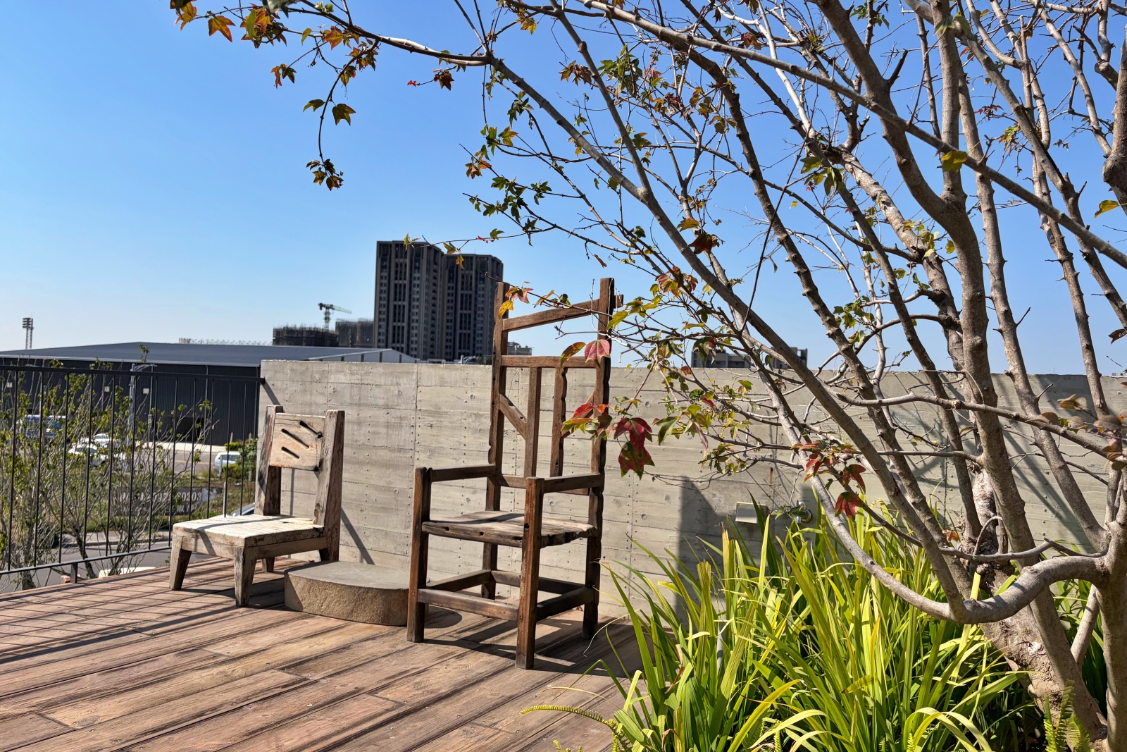 沿著戶外坡道緩步而上,二樓的觀景平台像是山徑上的休息站。坐下時,微風輕拂、光影流動,花木環繞,步伐自然放慢。
