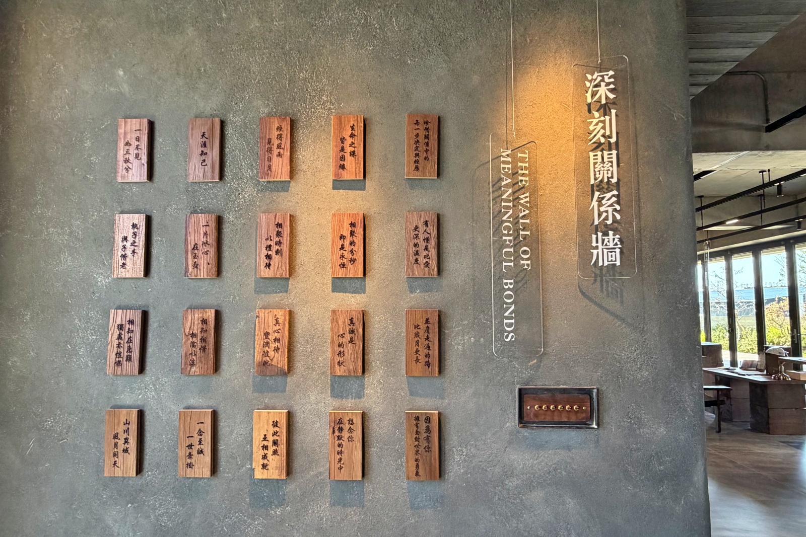 特別的是,這裡用建築落成剩下的原木,做成500片限量「金句木牌」,刻著各式關於陪伴、祝福與關係的小語。