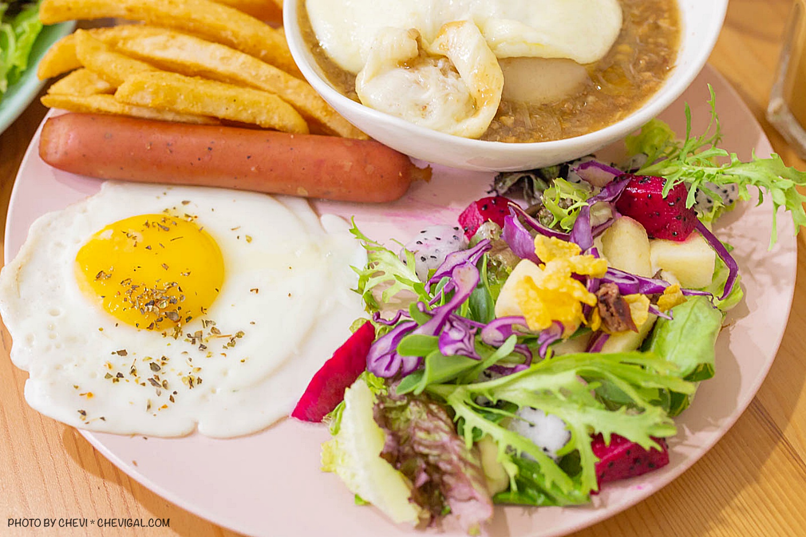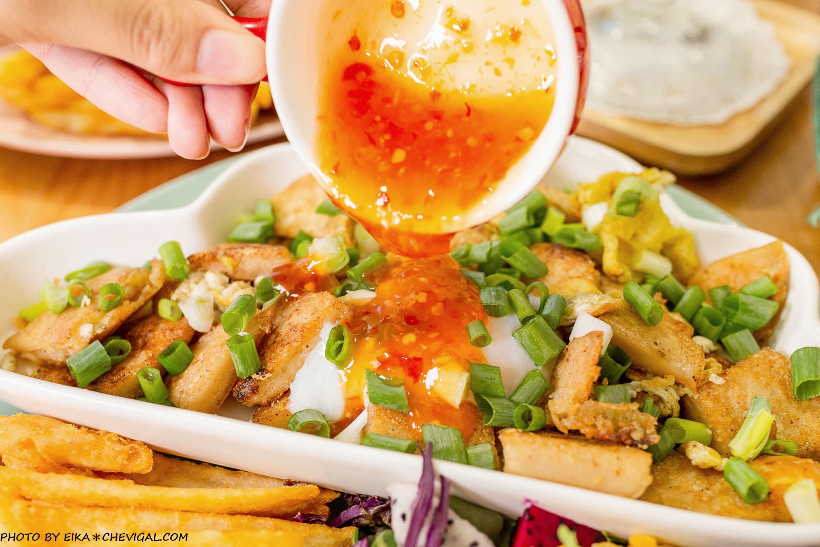 這款和前面的肉醬碗粿一樣也可以自己DIY,將一旁的蔥花和水波蛋倒入米米煎,再依個人喜好淋上泰式辣醬,使得酥脆的米米煎多了幾分潤口,微酸微辣特別夠味。