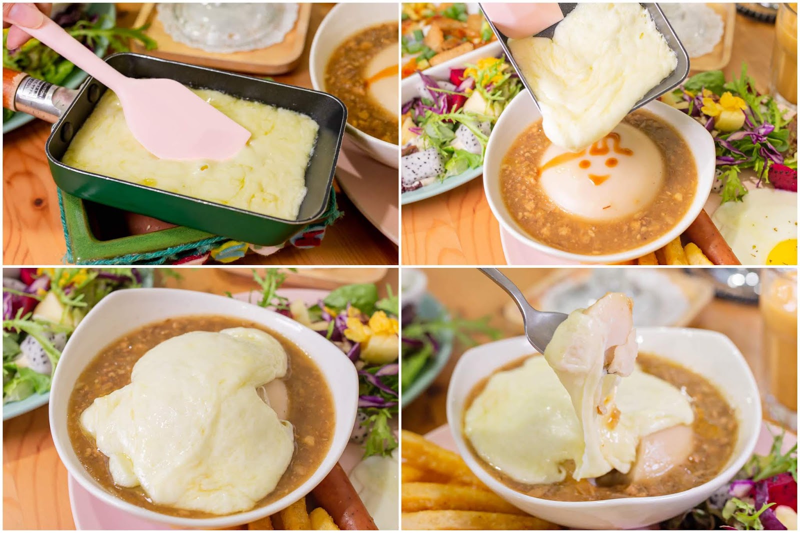 我們覺得加熱起司的過程特別有趣,看著起司慢慢融化,等待整鍋起司融化後就可以趕快倒入肉醬碗粿啦!倒的時候要快、狠、準,否則起司很快又會凝固,拉起來就不太會牽絲啦~