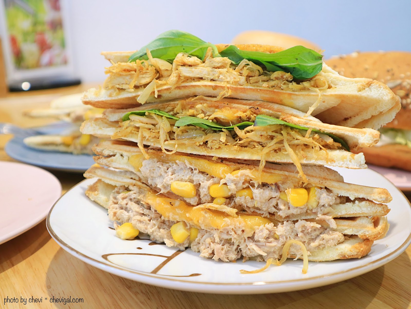 玉米鮪魚起司$55元×雞肉牽絲起司$65元,大胃王朋友覺得前面都還沒有吃飽嗎?雖然魚編早就已經飽到天靈蓋了,但是還是要和你們介紹這兩份超浮誇的熱壓吐司,疊在一起的高度真的很驚人啊~
