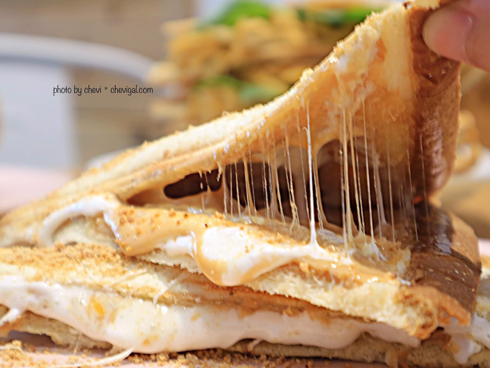 喔喔喔天啊!這牽絲真的很誇張,而且是可以重覆牽絲的,不會像起司凝固後就失去了牽絲的效果~棉花糖的糖香搭配花生的堅果香氣,甜點控根本就快要受不了啦!