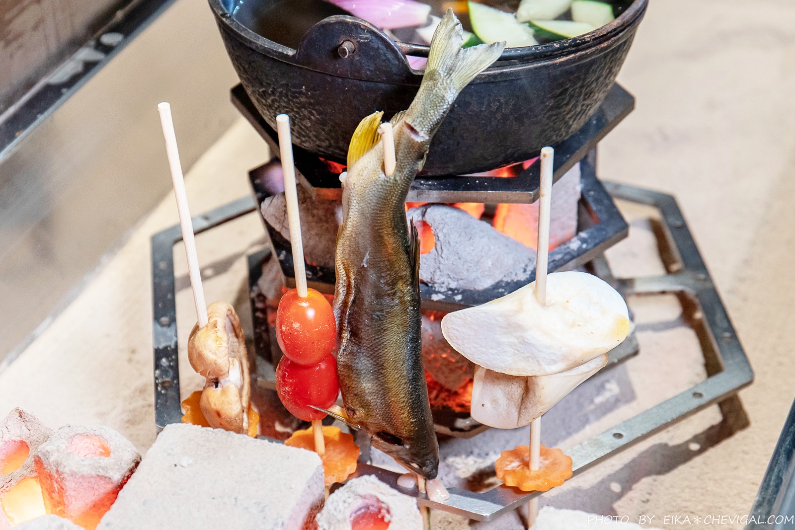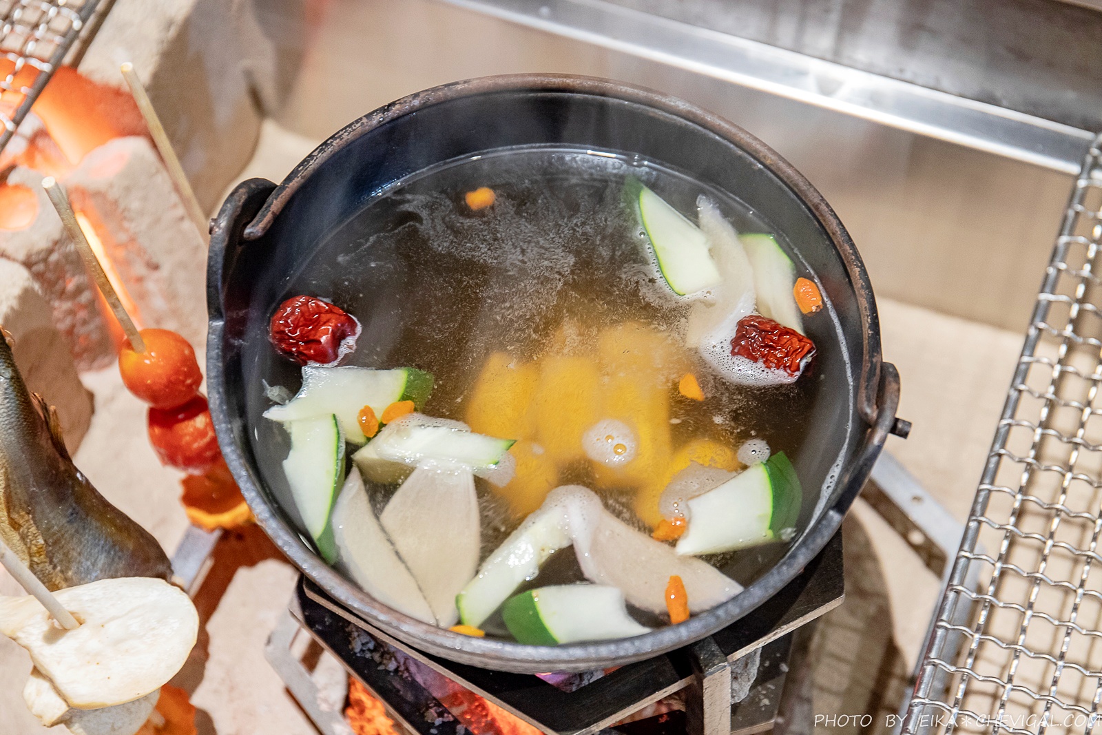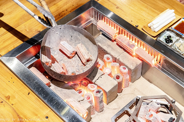 對了,整套囲炉裏的烤具都是由日本引進,炭火加熱的設計不僅更貼近日本圍爐的情境,中間還有爐架可以同時煮湯,真的十分方便!不過必須要說溫度真的超級高,冬天來圍爐取暖應該會很讚XD