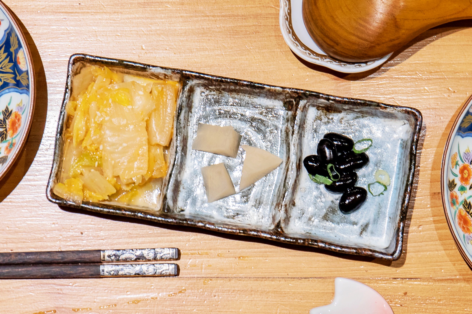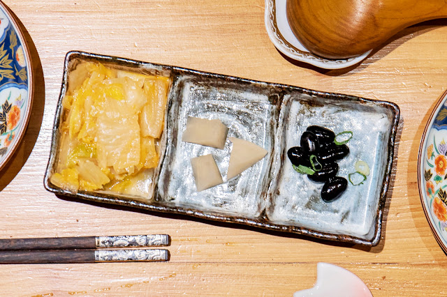 開胃小菜共有三道,分別是締藏親釀的黃金泡菜、漬蘿蔔與日本蜜黑豆,吃起來特別清新爽口,用餐過程當中享用也很解膩。