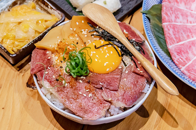 另一款主食為和牛玉子丼飯(加購價為$99元),看到丼飯表面都是滿滿的和牛,從沒吃過和牛的友人都準備要暴動啦!上頭的蔥珠與水煮蛋一同拌飯,溫潤鹹甜的風味當中,吃得到牛肉的厚度與彈性,讓人一吃就上癮!