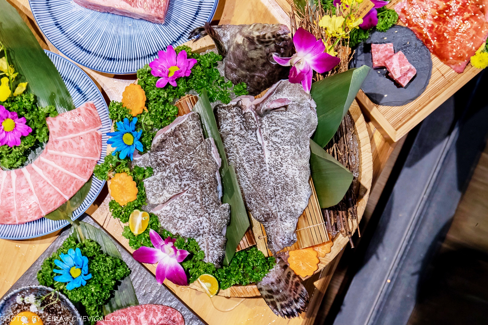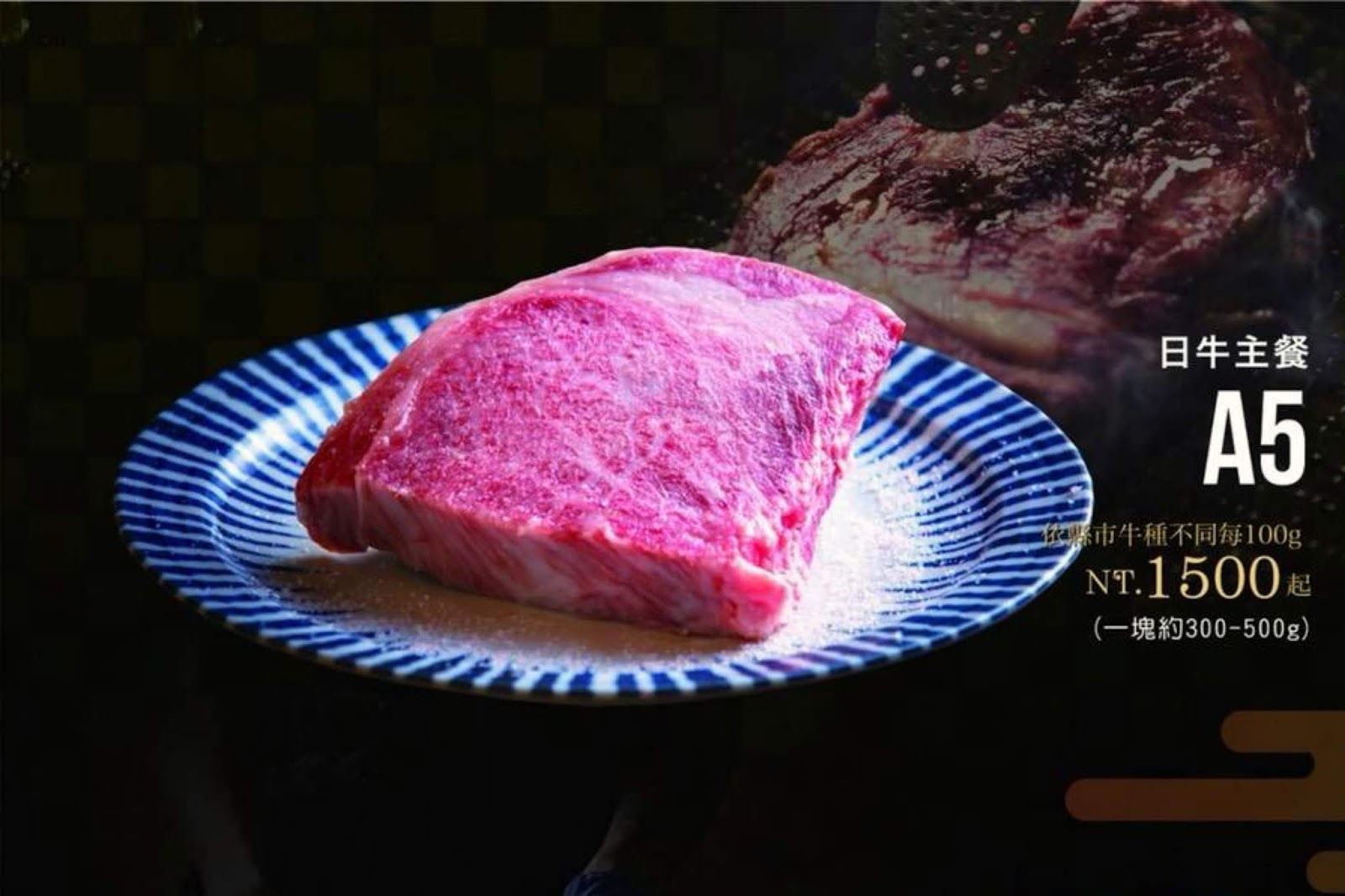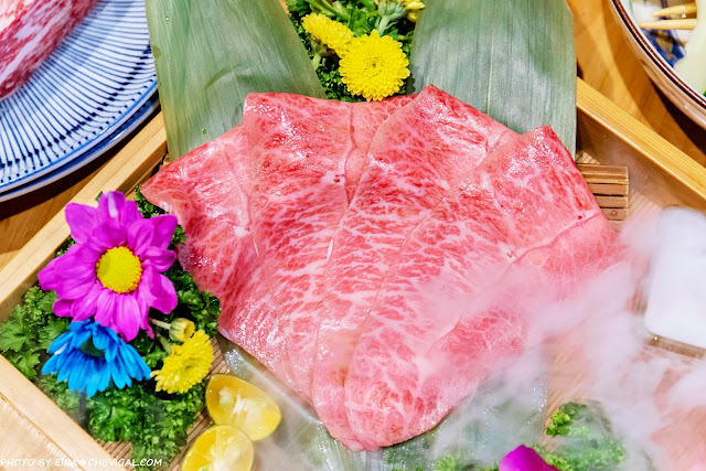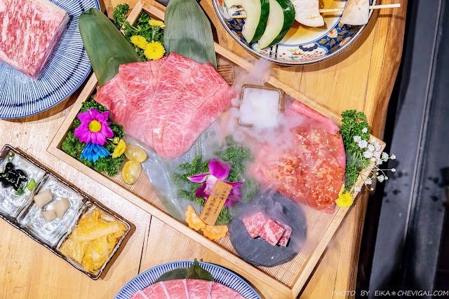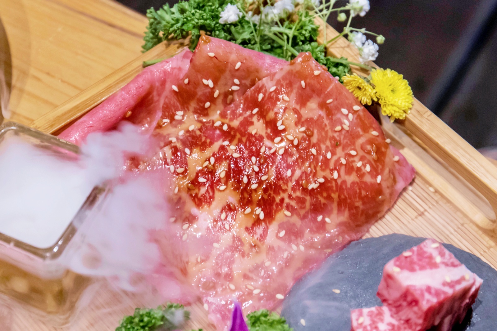 和牛盛合一上桌的氣勢真的仙到不行!美麗的油花紋理,被白煙飄渺的乾冰圍繞著,整體質感大大提升。裡面則有日本A5和牛板腱、日本A5和牛牛腿肉與日本A5和牛菲力。