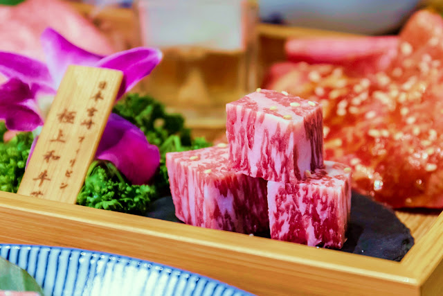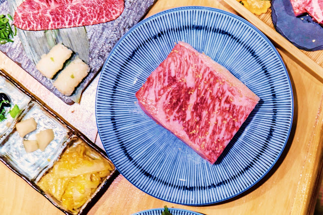 日本A5和牛牛腿肉是和牛盛合當中,唯一會先在表面塗抹燒烤醬的肉品,其他則是撒上薄鹽調味。原本想說燒烤醬的色澤特別鮮紅,擔心口味會比較鹹膩,結果事實證明完全是我們多慮了啊XD