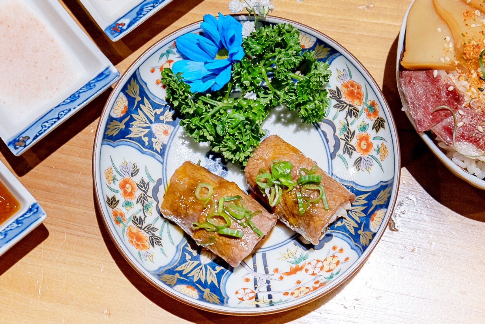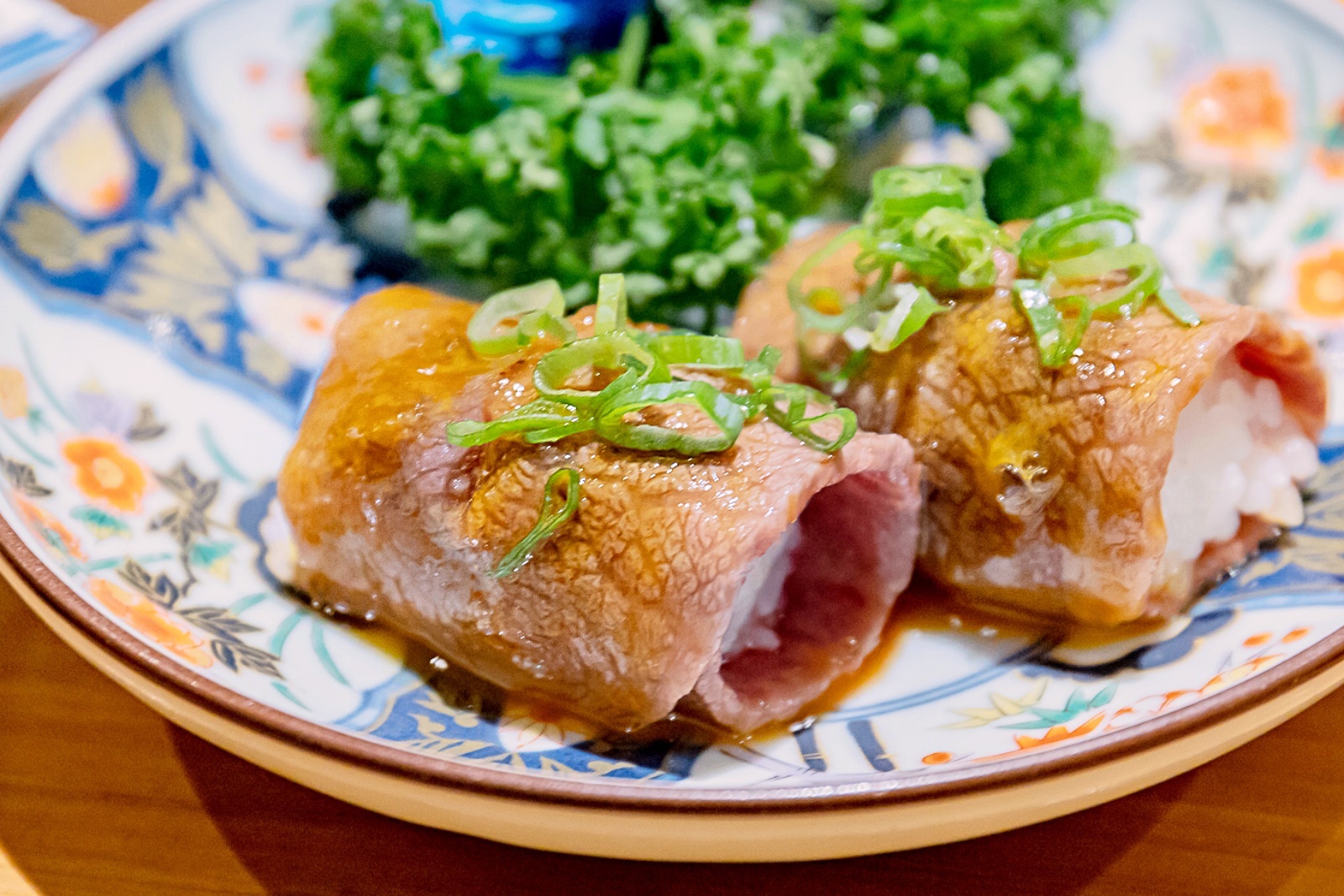 將裹上蛋液的和牛板腱烤至約七分熟,肉質粉嫩多汁,接著再捲入飽滿的新潟縣魚沼米,最後再擺盤後送至眼前,讓人同時可以擁有視覺上、味覺上的雙重享受!