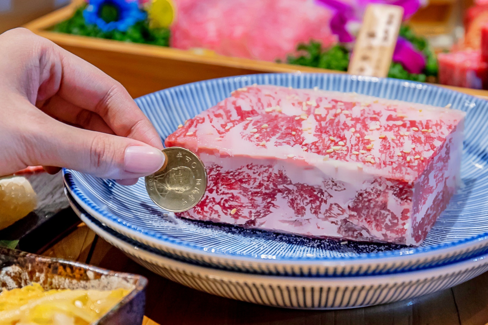 前面已經有和你們介紹過這份宮崎和牛的份量到底有多誇張了!沒想到我們拿出五十元硬幣比一比,真的實在是太猛了!因為這和牛的厚度竟然比硬幣還要厚!就別問我們為什麼跪著吃完這份和牛了XD