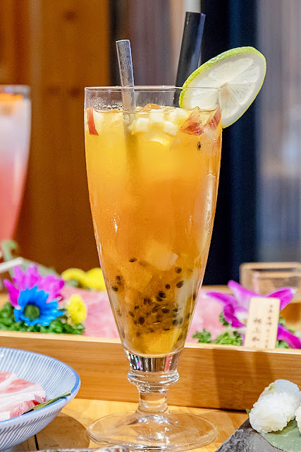 水果茶裡面含有百香果、鳳梨、蘋果與蜂蜜,整杯喝起來的果香甜蜜,很適合搭配燒肉享用!
