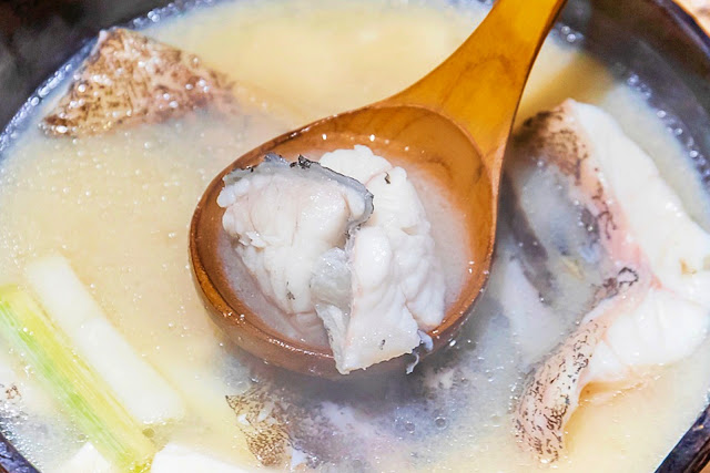 珍珠龍膽石斑有著滿滿的膠質,肉質十分細緻滑嫩;搭配溫潤不死鹹的味噌湯頭,反而更能襯托出魚肉本身的鮮甜,非常好喝!