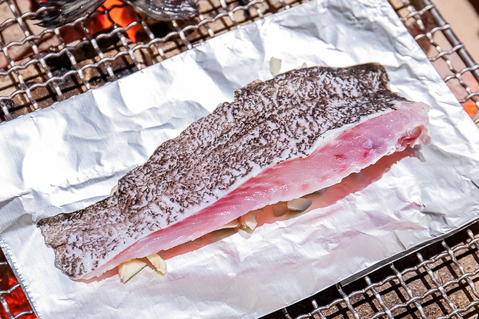 再來準備要烤龍膽石斑,為了避免魚皮沾黏在烤網上,服務人員會很貼心地包覆上鋁箔紙,順便還能鎖住魚肉的鮮甜肉汁~