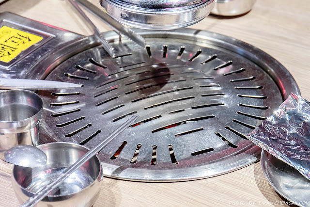 每桌爐子上方都有排煙管,烤夾與鋁箔紙會在入座時一起送上桌;其他像是湯匙、扁筷、杯子與衛生紙,都可以由餐桌靠近走道那側的抽屜內取用。