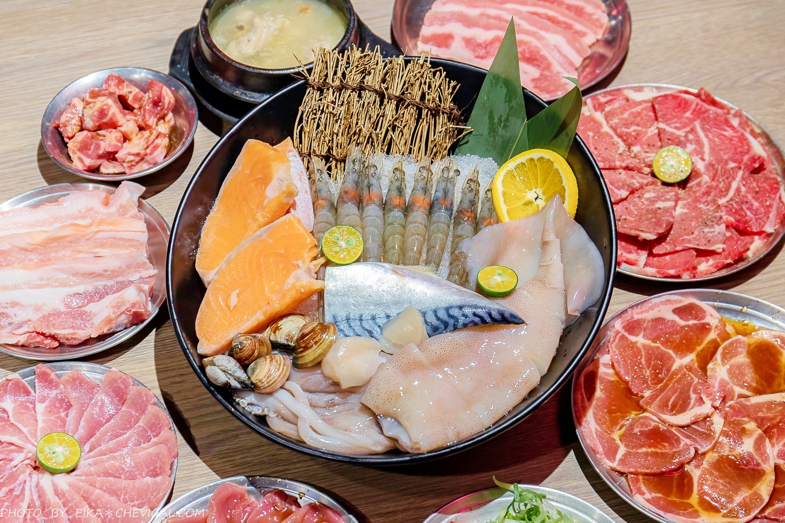 贈送的豪華海鮮盤份量也太誇張!裡面有著深海大鮮魷、挪威一夜干、特選鮮白蝦、加拿大鮭魚與蛤蜊,一次就能吃到多種海鮮,這份量兩至三人分享真的沒問題~