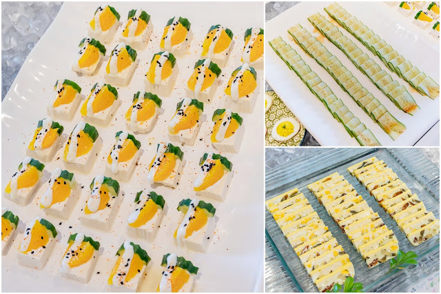 豆腐佐優格/芥末籽黃瓜捲/可口三色蛋,這三道的色澤與口味都很適合紓解夏日的燠熱,尤其是豆腐佐優格的口感清爽滑嫩,果香入口即化,相信小朋友們應該也會很愛!