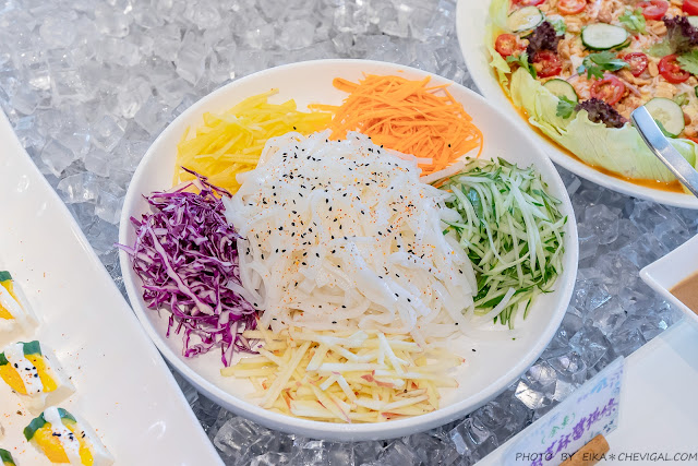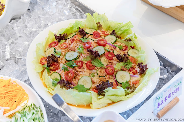 泰式米線沙拉,米線吃起來就像小一號的米苔目,口感香Q有咬勁,搭配各式蔬果與泰式醬汁調味,酸甜咕溜很涮嘴~