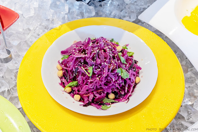 雪蓮子涼拌紫高麗菜,雪蓮子也就是歐美與中東國家常見的「鷹嘴豆」,但是在台灣似乎並不多見,由此可見店家在選材上的用心與創意,而且這道還有滿滿的花青素哦!