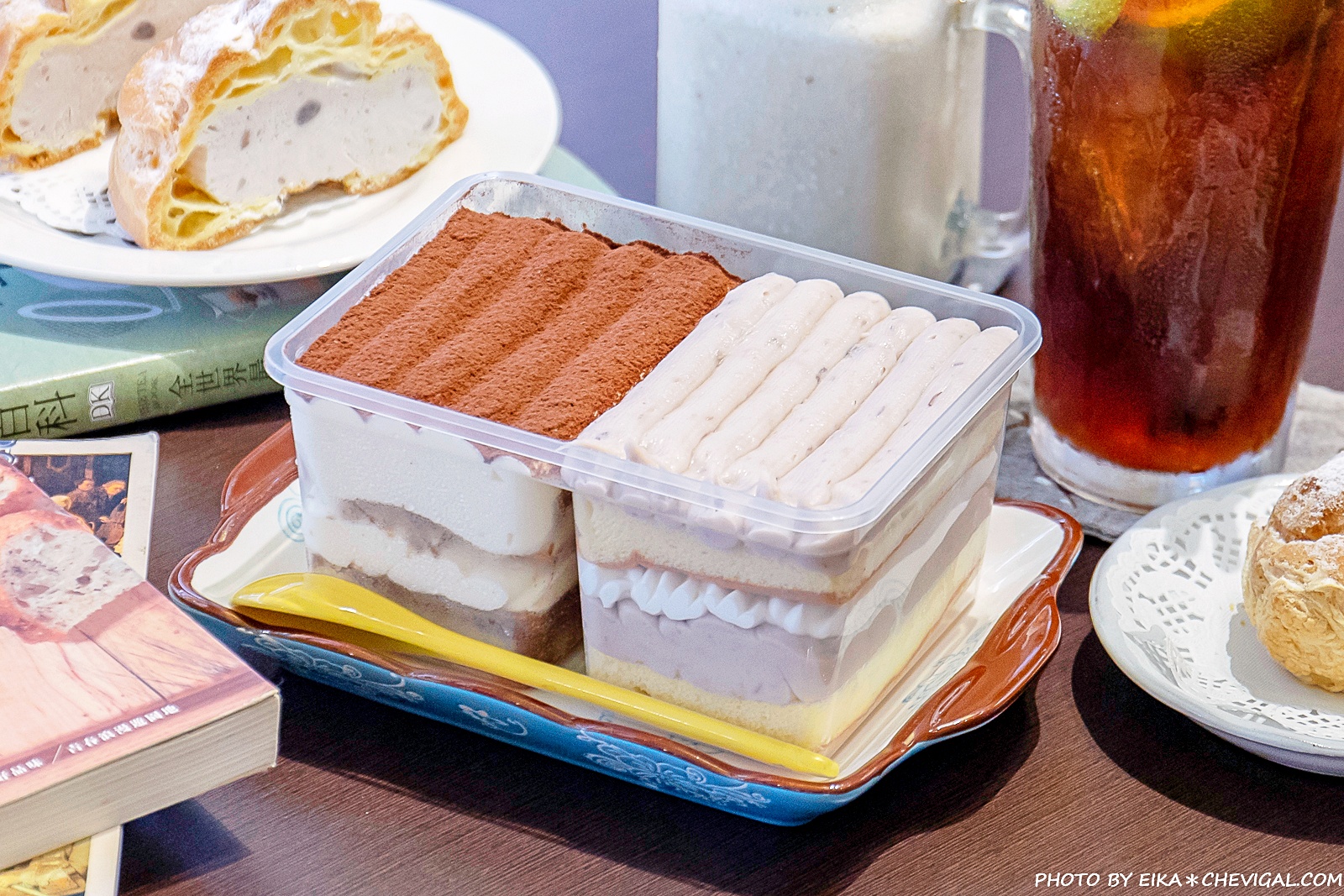 底下的戚風蛋糕香氣也很飽滿,可惜的是水分含量較少,口感會稍嫌偏乾一些。如果戚風蛋糕的水分含量能再提高一些,提拉米蘇整體的口感會更加細緻順口;而另一款芋泥口味的份量真的給得很大方,吃起來會感覺到芋泥的比例比蛋糕體來得多,蛋糕的口感相較之下就沒有那麼明顯了XD