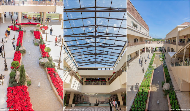 各棟之間擁有類似威尼斯水道的噴水池造景,現在更有美麗的聖誕紅點綴,看起來更加熱鬧。中央廣場抬頭還能仰望蔚藍的天空,一樓建築的盡頭也有提供威尼斯水道的佈置可以打卡拍照。