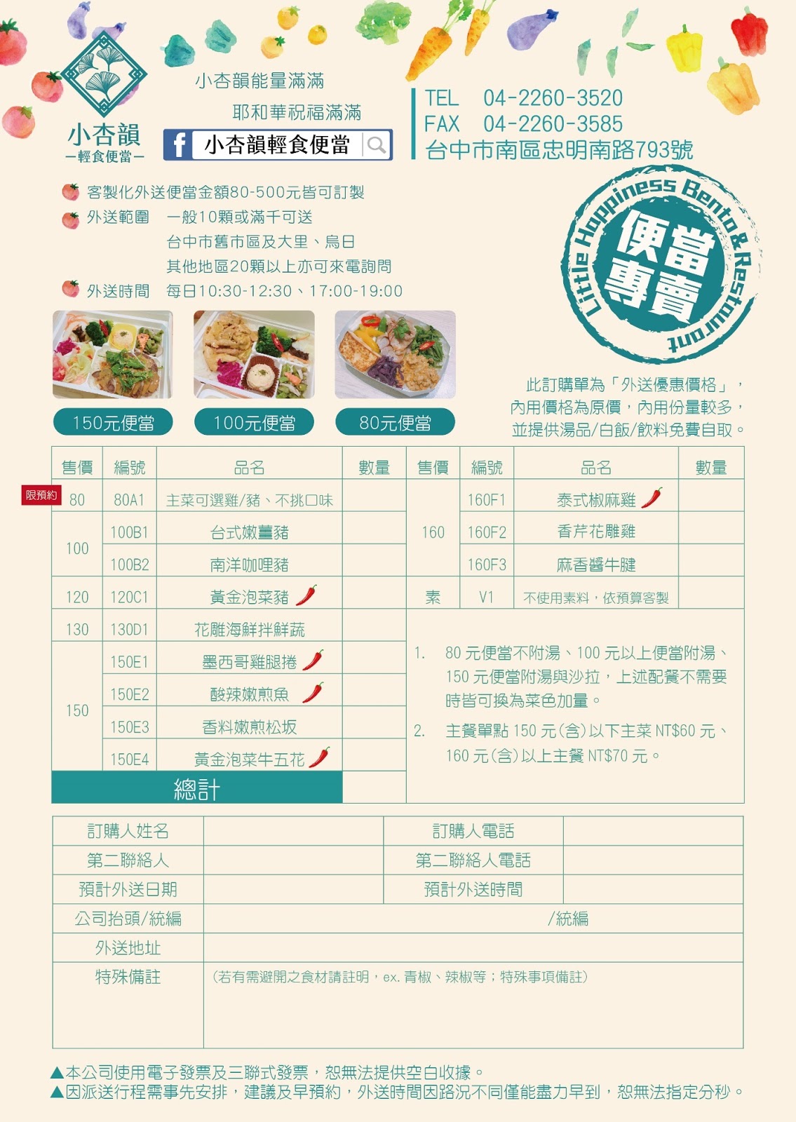 位在忠明南路上的小杏韻,介於建國路與復興路之間;除了有南區附近的商辦會打電話來訂餐外送,大里與烏日一帶也有提供外送服務,讓中午與晚餐又多了不同的用餐選擇。(目前已無門市,資訊更新於文末)