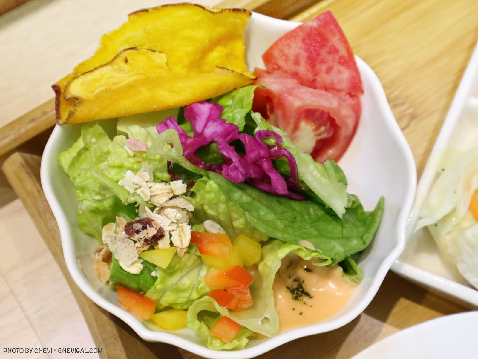 沙拉的食材多元繽紛,運用新鮮時蔬與水果入菜,加入適量的沙拉醬,清爽而有基本的飽足感。