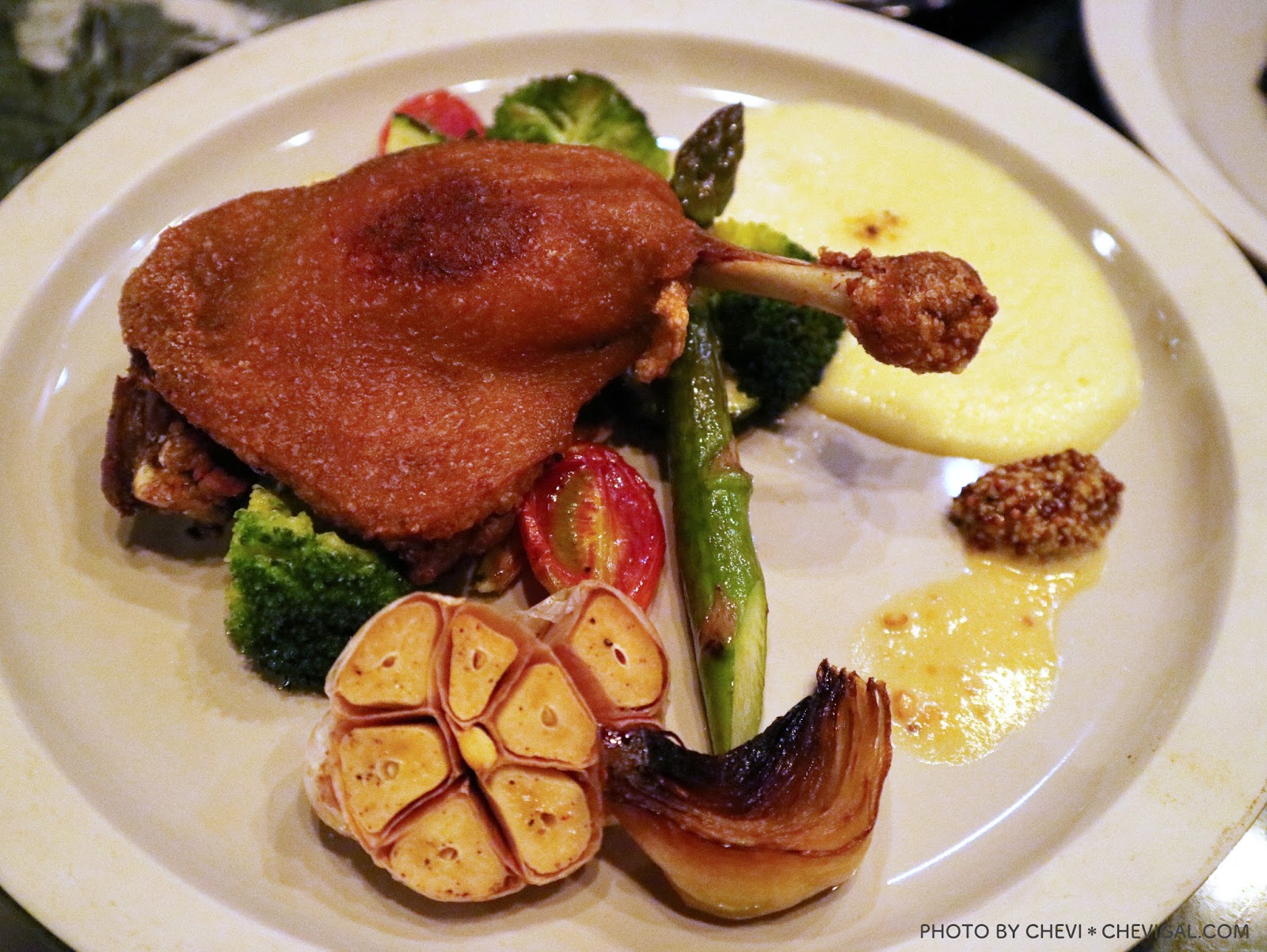 常常聽到櫻桃鴨,卻不知道為什麼叫做櫻桃鴨嗎?當然不可能是吃櫻桃長大的~而是因為這樣的鴨種是來自於英國的櫻桃谷。以鴨油醃漬油封的櫻桃鴨,吃來肉質有嚼勁,不會卡牙,另外還搭配上蘆筍、青花菜、番茄、玉米筍、蒜頭等蔬果,食材可謂豐富多元。