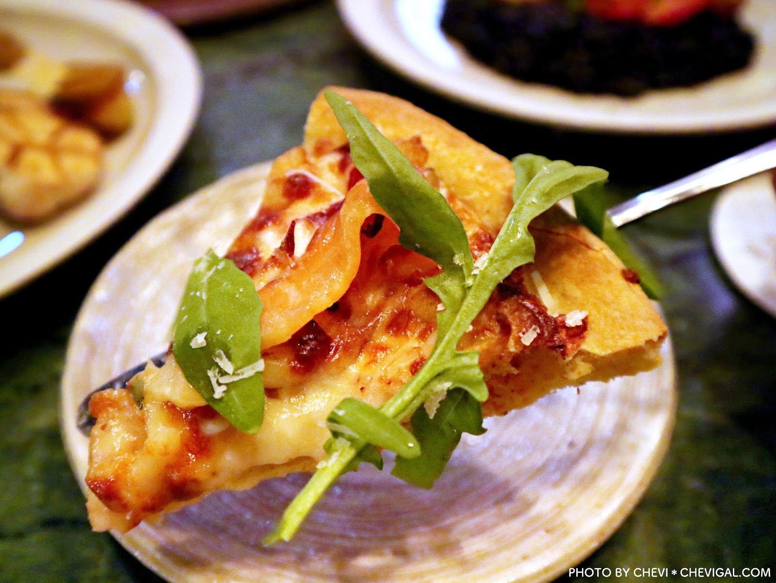 這道可以說是當天整桌朋友公認最愛的一道餐點,餅皮是手工製作的香草麵糰,吃來外酥內軟、膨軟也有厚度。舖上經過醃漬脫水熟成的鮭魚、白蝦仁及透抽,入口的鮮味與飽嘴感不言而喻!