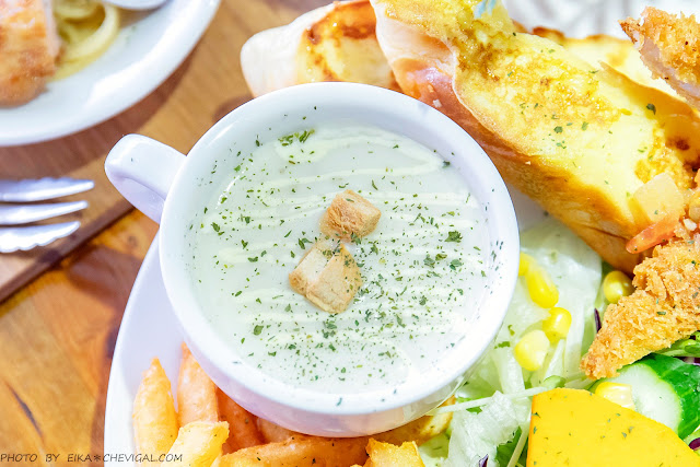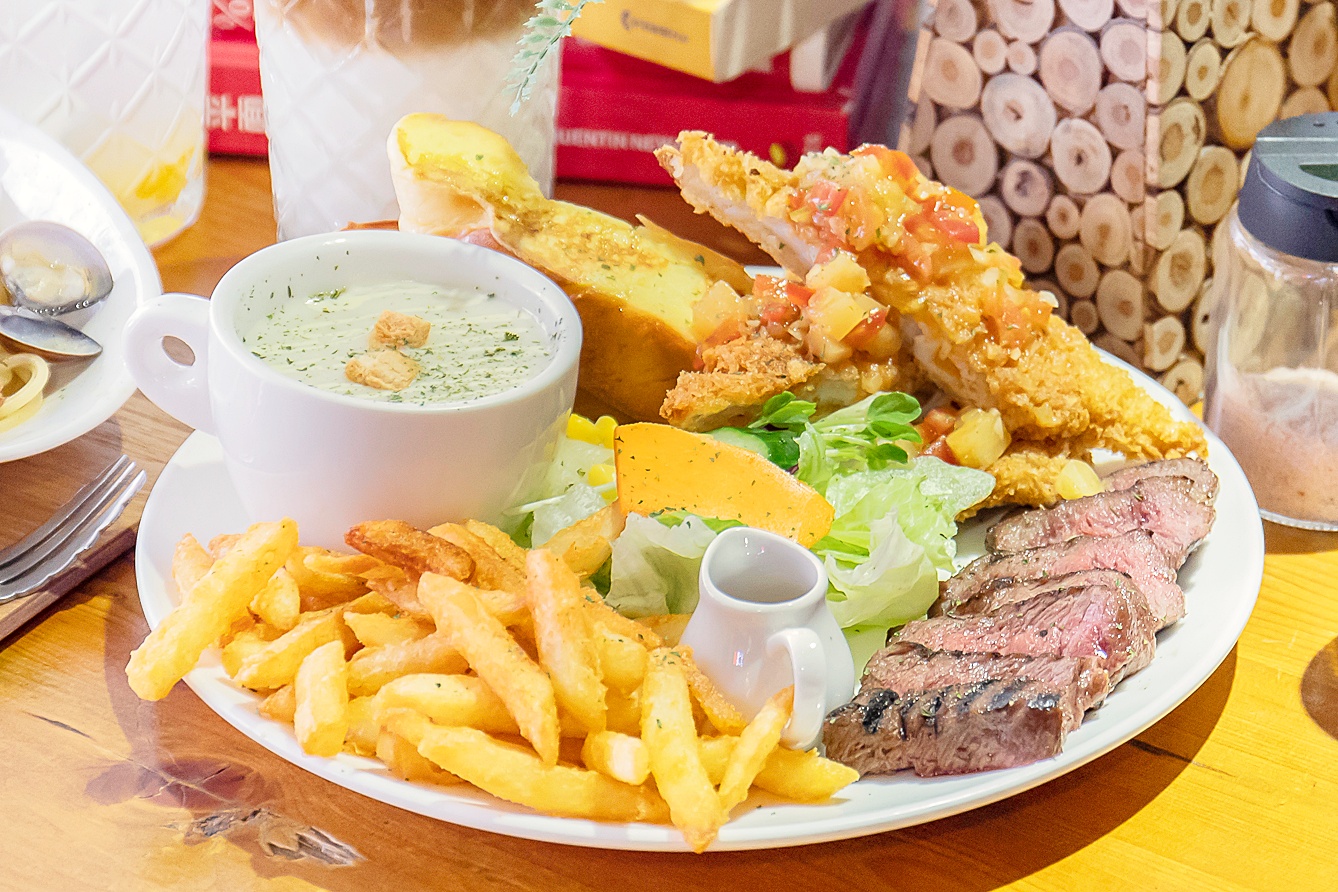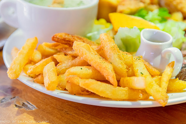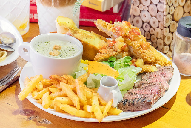 霸王海陸羅宋餐盤的份量真的很誇張,整份有濃湯、薯條、沙拉、香煎羅宋麵包、酥炸魚排與澳洲嫩肩牛,光是能夠一次吃到兩種肉品就很有誠意,一般女生應該會吃不完。