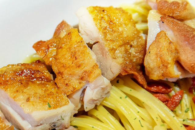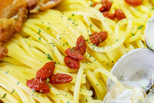 餐點在上桌時就能聞到花雕燒酒的迷人香氣,在麵條表面上還能看到枸杞,真的是頗具新意的口味組合。如果你們吃膩了普通口味的義式料理,不妨可以來嚐鮮看看~