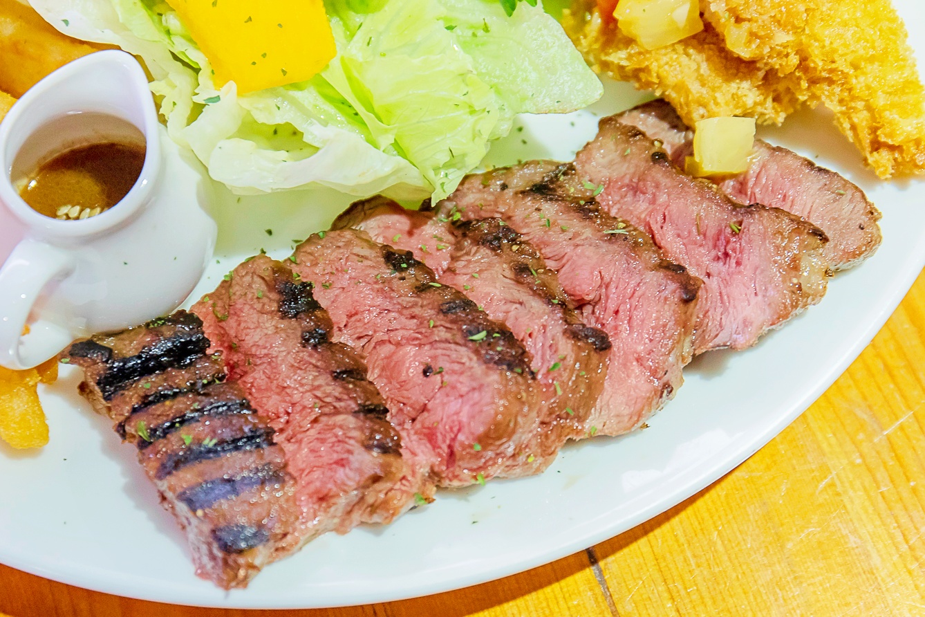 我們選擇的熟度就是七分熟,可以看到肉質仍帶有淡淡的粉嫩色澤,吃來多汁軟嫩又不失嚼勁。不過也因為牛肉是以鐵板煎烤,焦香會比肉質本身的甜味來得明顯,稍嫌可惜。