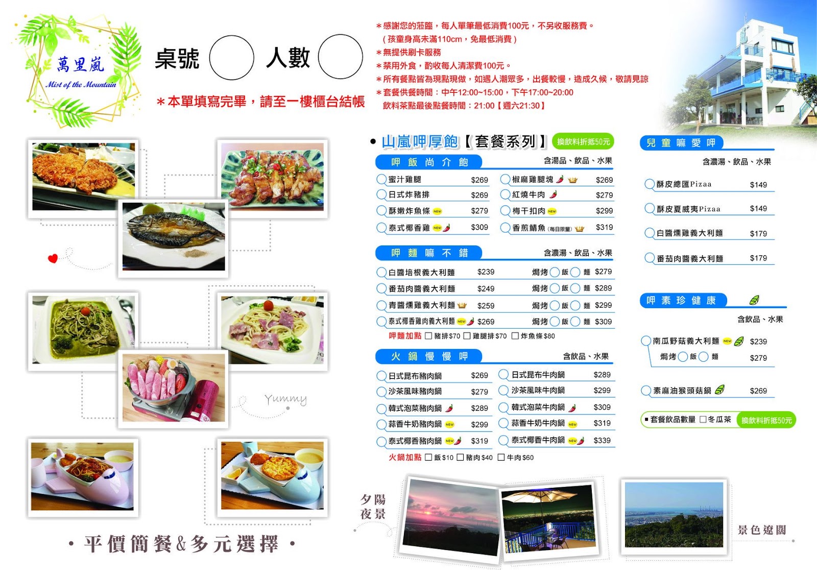 這邊提供萬里嵐目前的菜單給你們參考,每人低消為一百元,不另收服務費,身高未滿110cm的小朋友免低消。正餐目前是供應至晚上八點,點心類的餐點則是供應至打烊前一小時。