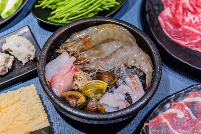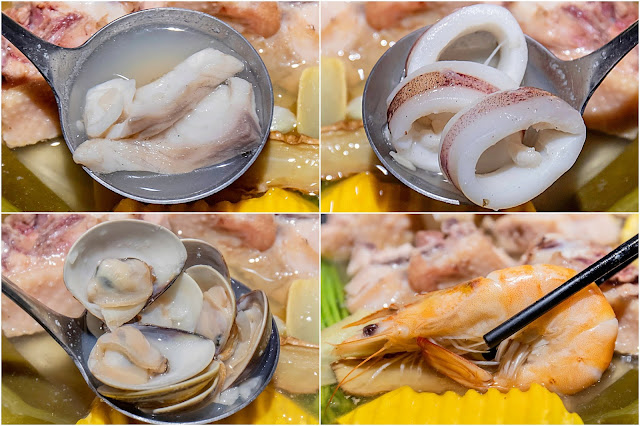 海鮮小拼盤裡面有鯛魚、蛤蜊、透抽與蝦子,食材的新鮮度也很不錯,搭配獨家爆爆蛤蜊鍋更顯鮮甜。