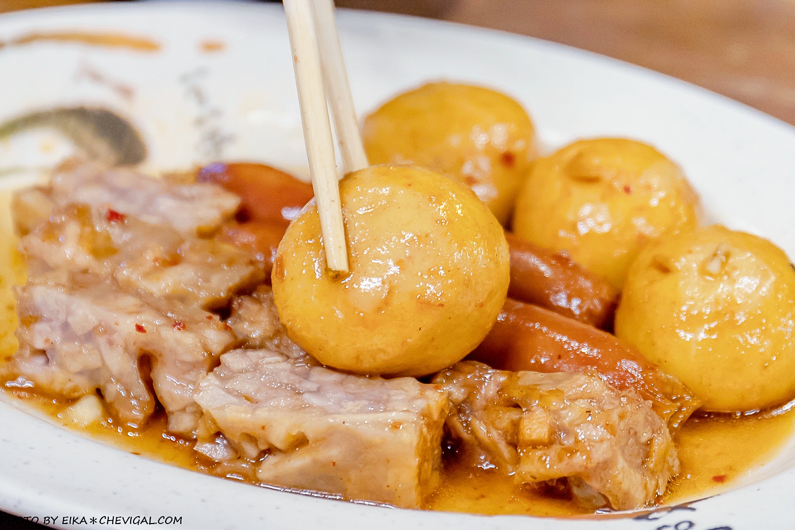 柔嫩彈牙的魚漿外皮,咬開來就能看到滿滿的金黃餡料,香甜之中還帶有芥末的微辛,意外地與秘醬的鹹甜五香風味非常合拍,十足的爆漿口感吃起來特別過癮~