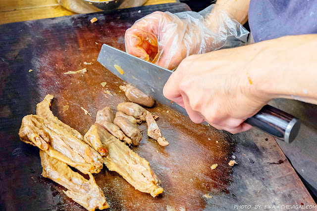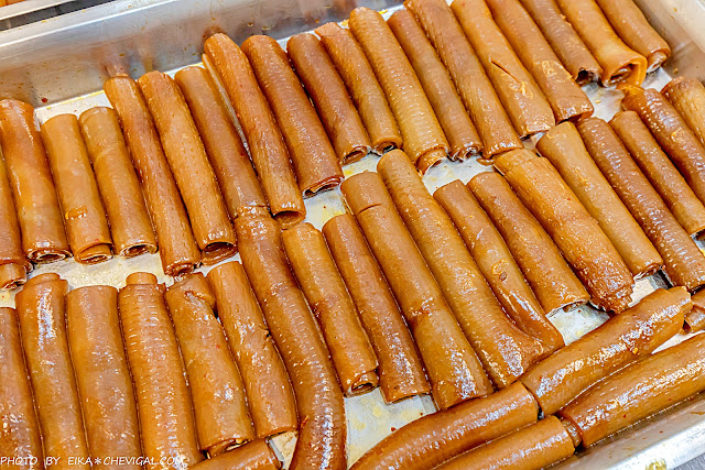 如果看到這麼多豬皮真的別驚訝,原來秘醬滷味總店也有負責製作加盟店的醬汁與相關食材,這天來訪就剛好看到店家正在手工卷起一捲捲油亮的豬皮,特別美味誘人~
