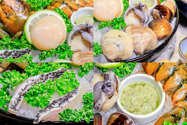 精緻加購海鮮盤則包含了活波士頓龍蝦、活石斑魚片、活鮑魚、活牛奶貝、蛤蜊與北海道生食干貝;不論是自己獨享,或是與家人朋友分享都很OK~