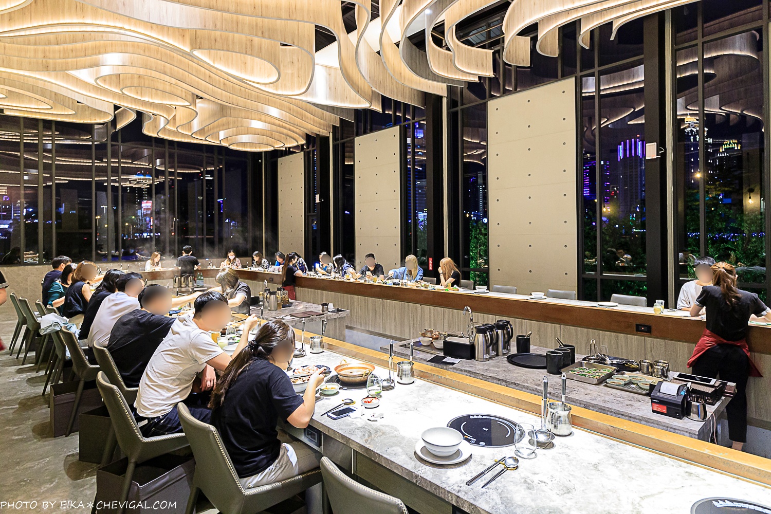 室內本身還有經過挑高,加上流線木質的獨特天花板造型,窗外不時透映著繁華的七期夜景,而且還有專人提供桌前服務,特別適合情侶、夫妻或朋友一起來用餐。
