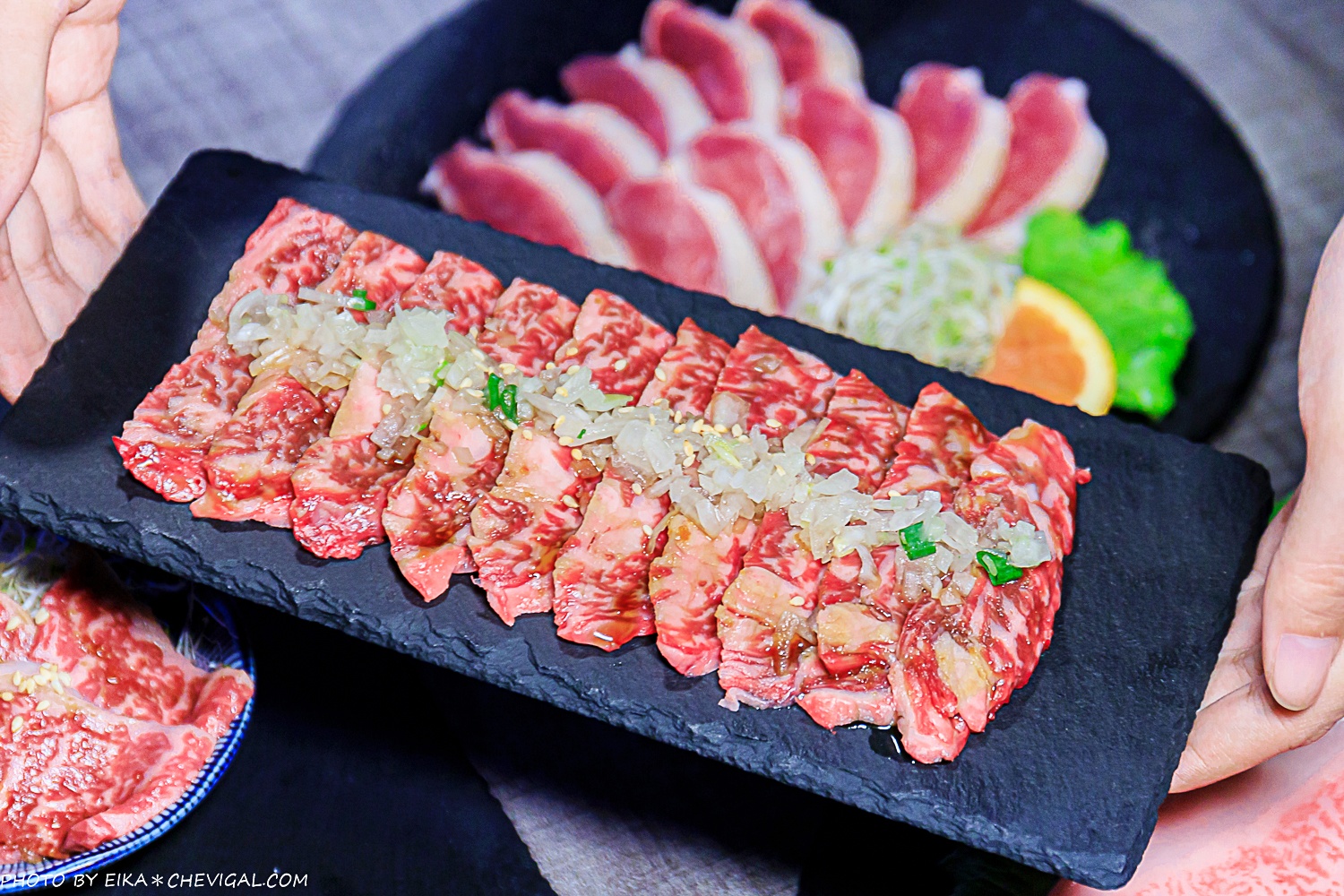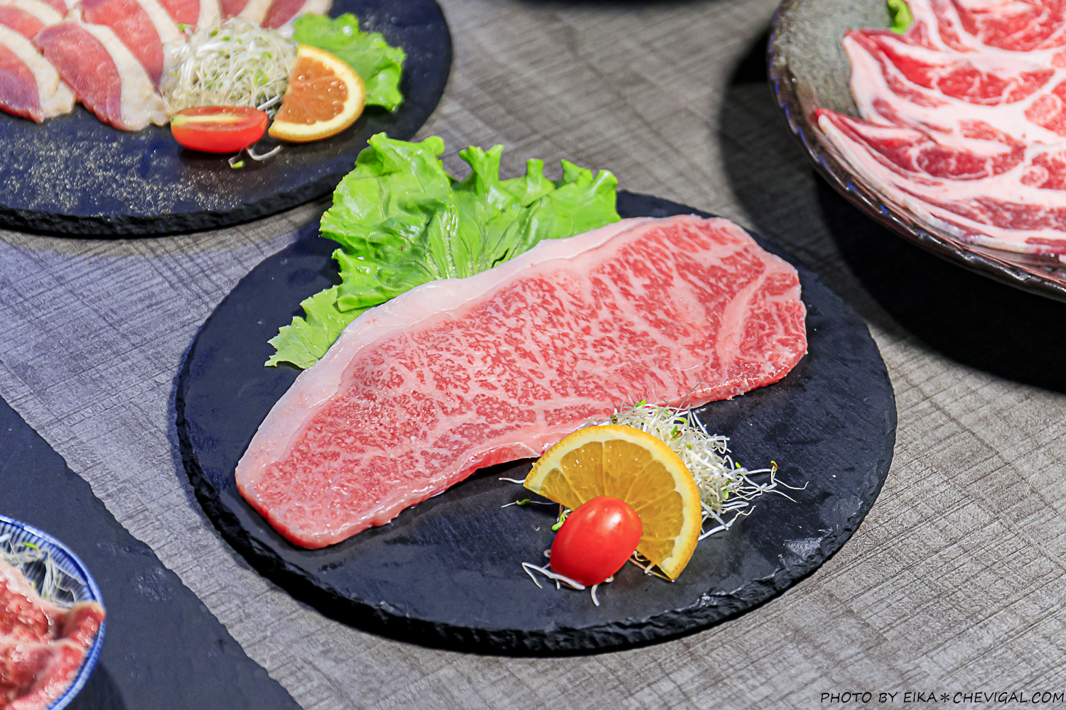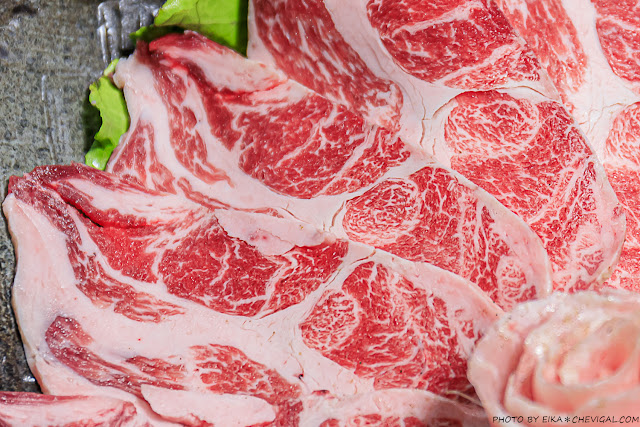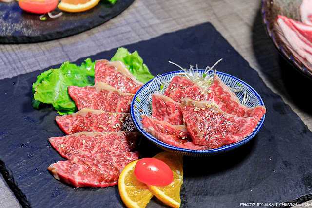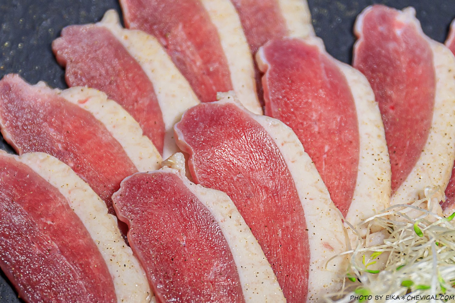 這份極品和牛套餐裡面,除了有牛肉與豬肉之外,特別的是還有搭配鴨肉;嚴選豪野櫻桃鴨胸的油花分佈均勻,燒烤過後的肉質不顯乾柴,口感香嫩細緻且略帶點彈性~