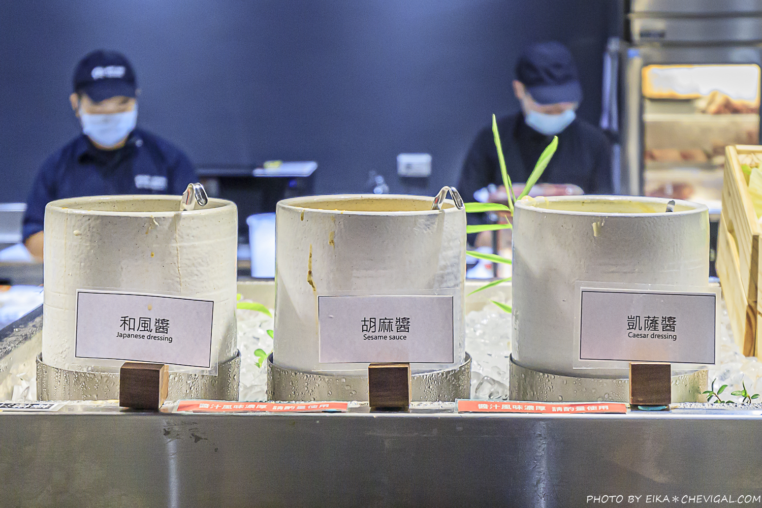 沙拉有提供和風醬、胡麻醬與凱薩醬等三款醬料可以搭配,愛吃哪種醬料就自己來,不用再和家人朋友爭論到底要哪種口味的沙拉啦!