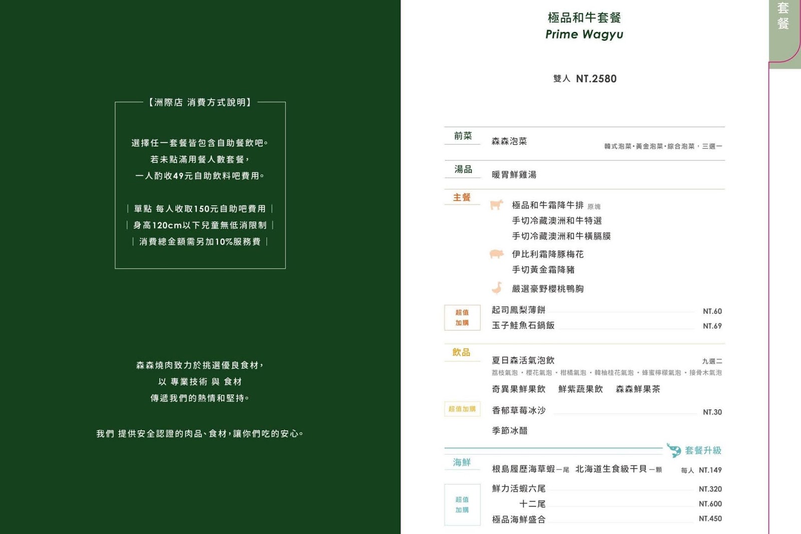 我們這天享用的是價值$2580元的極品和牛雙人套餐,包含了前菜、湯品、主餐與飲品,薄餅、石鍋飯、冰沙與海鮮都能升級加購。如果想要聚餐的話,另有三人、六人與八人套餐可以選擇,套餐皆包含自助餐飲吧,詳細菜單資訊可參考:訂位頁面。